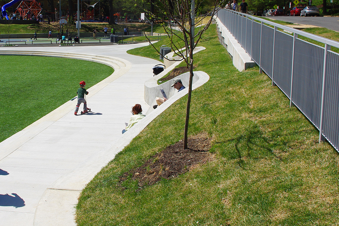 The award-winning Rocky Run Park was designed with the community in mind. Located on 2.65 acres in a densely populated area of Arlington, Virginia, the renovation serves a variety of users and addresses the needs of the community by providing a central gathering space and a renewed sense of place. The design overcame many hurdles, including an extreme grade change and an ambitious program within a small urban footprint.